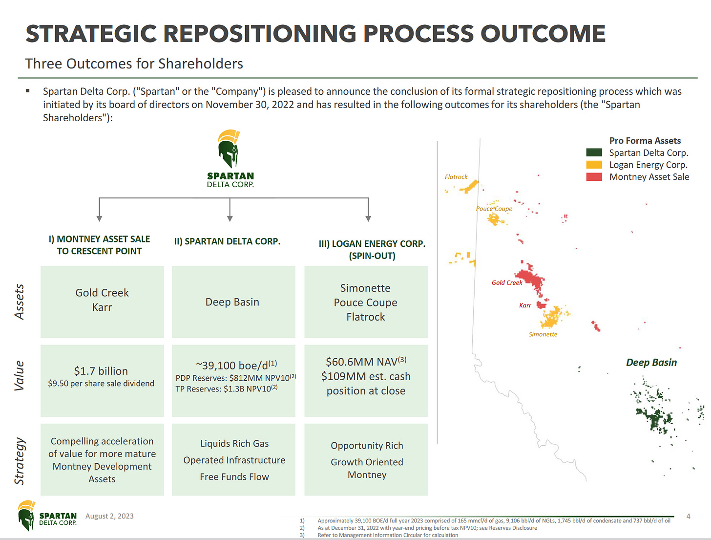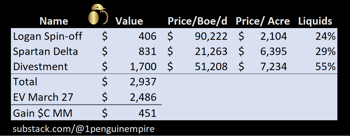 By the summer of 2023, Spartan Delta had, once again, entered into a sale of assets. As mentioned above, Spartan Delta split into three parts: 1. Logan Energy, 2. assets sold off to Crescent Point for C$ 1.7 billion, and 3. the remaining assets held by Spartan Delta. When Spartan Delta announced its financials for the period ending June 2023, Spartan Delta recorded on its income statement a GAIN of ~ C$ 549 million on the sale of its assets.